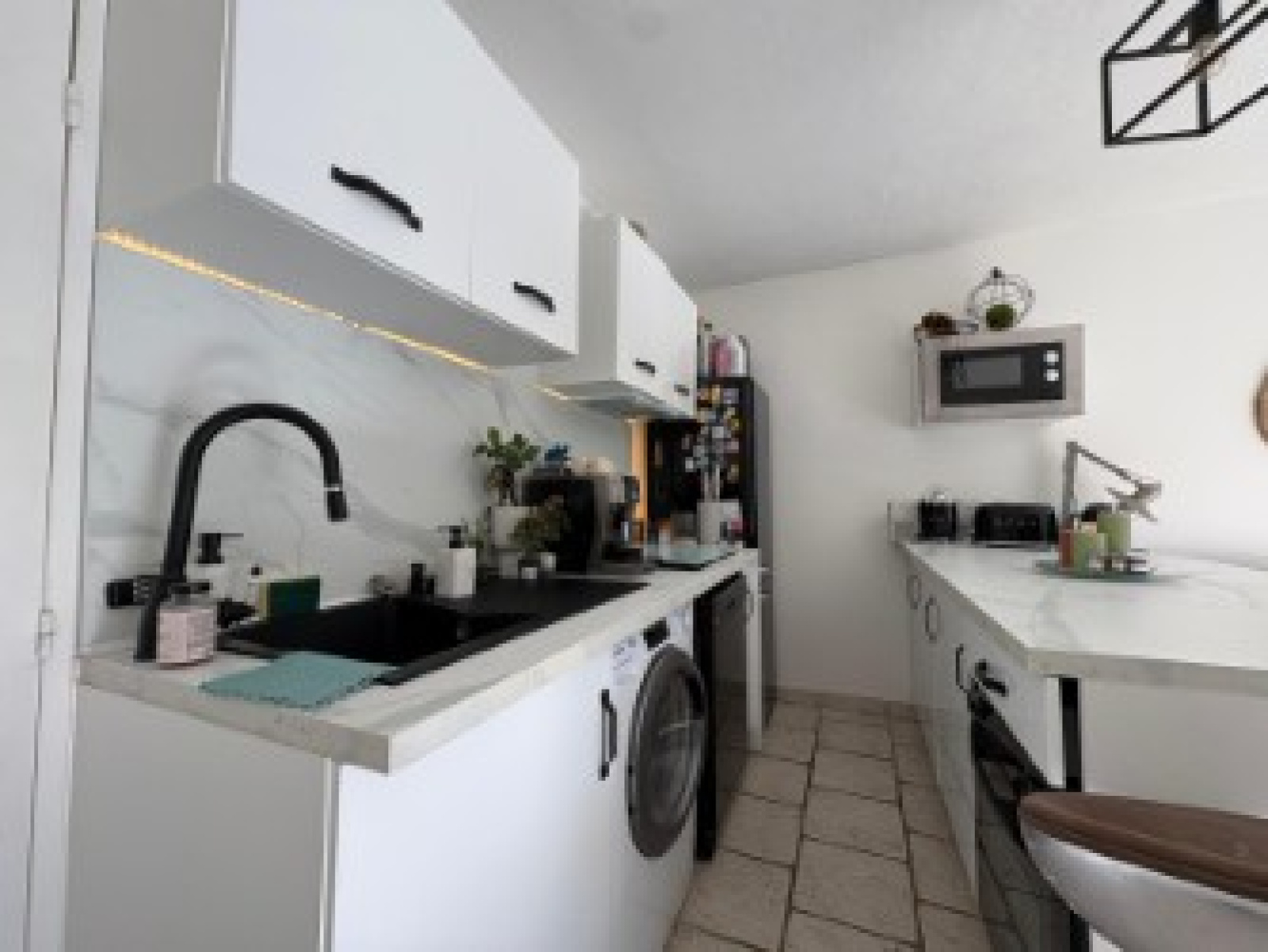 Côté nuit : Deux chambres avec placards intégrés, Salle d’eau moderne en marbre, WC séparé, Buanderie et espace bureau astucieusement aménagé